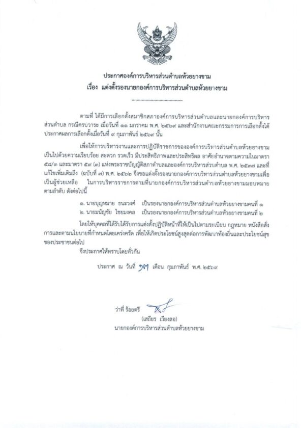 4. ประกาศองค์การบริหารส่วนตำบลห้วยยางขาม เรื่อง แต่งตั้ง เลขานุการนายกองค์การบริหารส่วนตำบลห้วยยางขาม