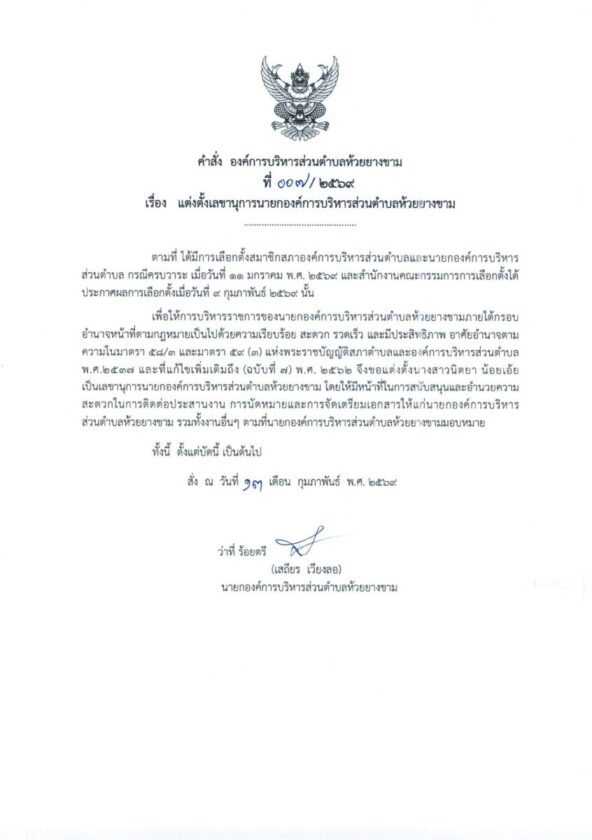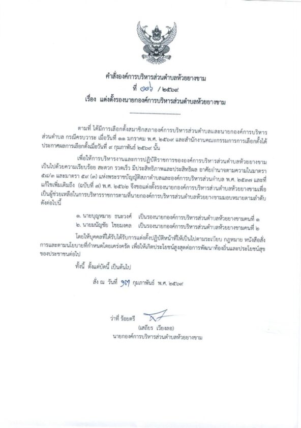 1.คำสั่งองค์การบริหารส่วนตำบลห้วยยางขาม เรื่อง แต่งตั้ง รองนายกองค์การบริหารส่วนตำบลห้วยยางขาม