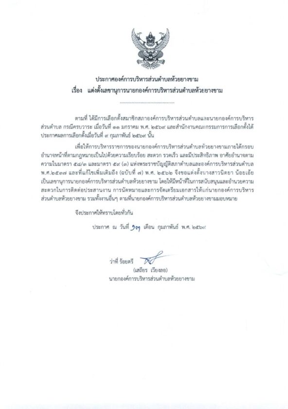 4. ประกาศองค์การบริหารส่วนตำบลห้วยยางขาม เรื่อง แต่งตั้ง เลขานุการนายกองค์การบริหารส่วนตำบลห้วยยางขาม